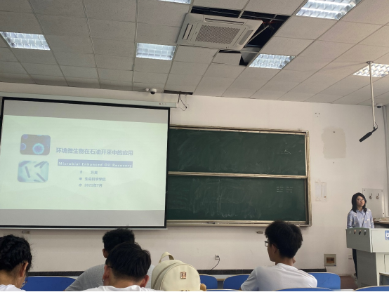 万昊老师的报告围绕微生物采油技术原理、工艺流程、国内外油田研究进展及微生物采油的核心技术等4个方面进行深入浅出地讲解,中间不时穿插动画短片等多媒体生动形象地向同学们展示,帮助同学们理解。万昊老师介绍微生物采油技术可实现高效低成本开采,实现油藏的保护性开采、可持续开发。近十几年来,随着生物技术的高速发展,尤其是高通量测序技术的应用,实现了油藏极端环境微生物群落结构与动态演变规律的快速准确解析,及油藏采油功能菌的定向激活和精准调控,促使微生物采油技术进入快速发展阶段。该报告拓展了学生在微生物应用领域的思路,激发了学生学习的兴趣。