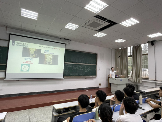 王小磊教授介绍了长波长光响应材料在生物医药领域的应用。首先,王教授以自己的求学以及工作的科研经历为楔子,让学生充分体会在科研路上的苦与甜。接着,以开展工作后的时间为线索,介绍了黄光的优势、由来、应用以及逐步拓展。而后,介绍了其代表工作:光照无损牙齿美白技术、光控雄性避孕技术、光照控制情绪与记忆、光照抑菌技术、光照解毒技术、光照精准减肥技术。该场报告知识与趣味相得益彰,掌声同笑声此起彼伏,让学生对长波长光在医学方面的应用有了很深的了解,同时学习了王小磊教授从生活中汲取灵感的思维方式,开阔了眼界,更激发了学习兴趣。