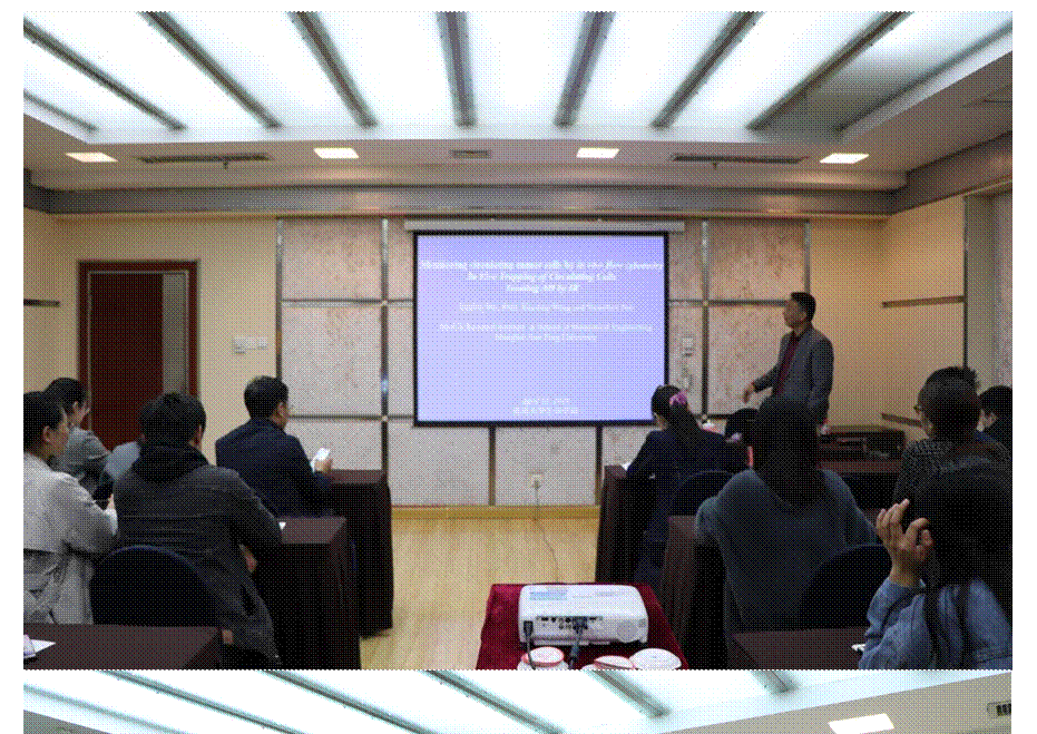 报告中,魏教授简要介绍了自己的科研经历。紧接着,他重点介绍了“在体流式细胞仪”,该细胞仪在实时高速荧光影像方法和体外流式细胞仪的基础上,创新性地设计了柱面镜光学系统,实现了在体、实时、无损、定量检测循环系统内细胞群体,满足了现有影像技术所不能提供的对细胞定量和在体监测的需求。魏教授指出,这项技术可用于循环肿瘤细胞的监测,适用于肿瘤等疾病的早期诊断和血细胞的免疫分析等研究。此外,他还展示了团队在科研方面取得的进展。最后,魏教授与参会师生就相关问题进行了互动交流,现场学术氛围浓厚,交流效果良好。