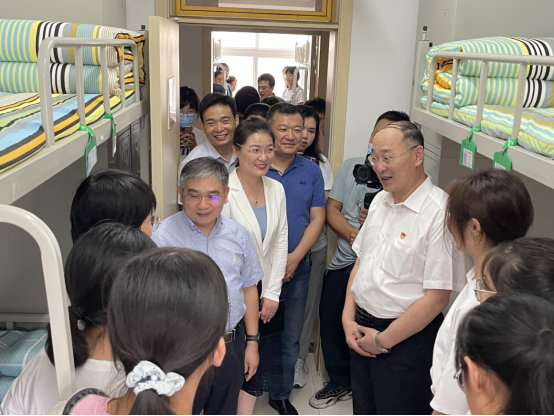 胡书记一行先后走访汇园2#新生宿舍,与新生亲切交流,“家是哪里的?”“到学校还适应吗?”“住的习惯吗?”每到一处,他都会亲切地询问,这些家乡风土人情、生活情况、入校感受轻松的对话迅速拉近了彼此的距离。他嘱咐孩子们及时给父母报平安,让家长们安心、放心。一个宿舍的同学们来自五湖四海,你们将一起度过四年的大学时光,是最亲密的同学、战友甚至家人,你们要彼此尊重,互相包容,友爱互助,共同进步。
