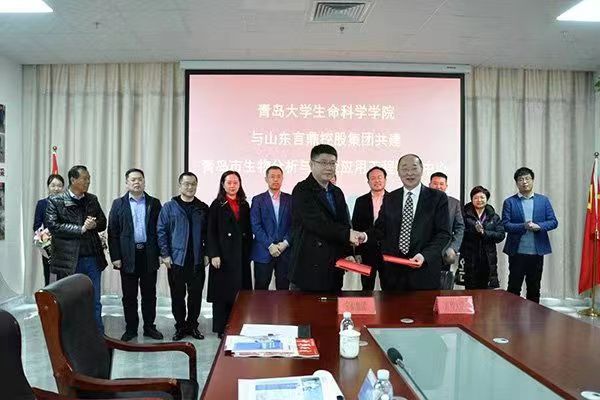 上午11点,揭牌仪式正式开始,薛冰书记代表太阳集团网tyc9728致辞,他表示:“以大健康产业为主要战略方向,立足国际前沿技术,大家一起为大健康事业添砖加瓦,共进一份力量。”战洪贤主席也表示:“相信在刘董事长和众多研究人员的带领下,以科研创新为依托,必能同时带动相关产业链全面发展。”在热烈的掌声中,校企联合青岛市生物分析与健康应用工程研究中心正式宣告成立。由公司董事长刘元柱先生带领言鼎生物专家肖乐义教授、太阳集团网tyc9728党委书记薛冰带领侯天侦院士、tyc太阳成集团9728前沿交叉学科研究院执行院长牛玉生先生、农业种子专家孙杰教授专家团队为研究中心签约、揭幕。