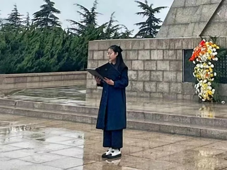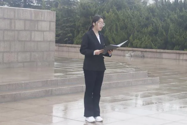 (全体人员向烈士默哀) (学生代表韩杰进行发言)