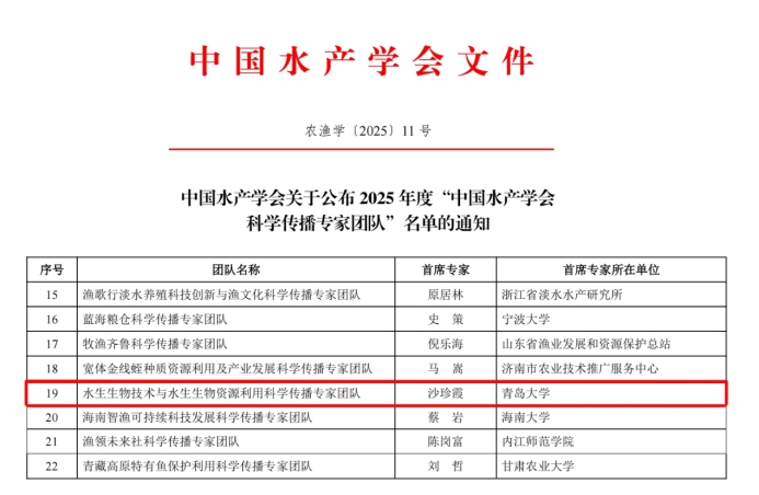 近日,中国水产学会正式发布《关于公布2025年度“中国水产学会科学传播专家团队”名单的通知》,太阳集团网tyc9728水生生物技术研究院沙珍霞教授牵头申报的“水生生物技术与水生生物资源利用科学传播专家团队”成功入选,成为全国22个获此殊荣的团队之一。