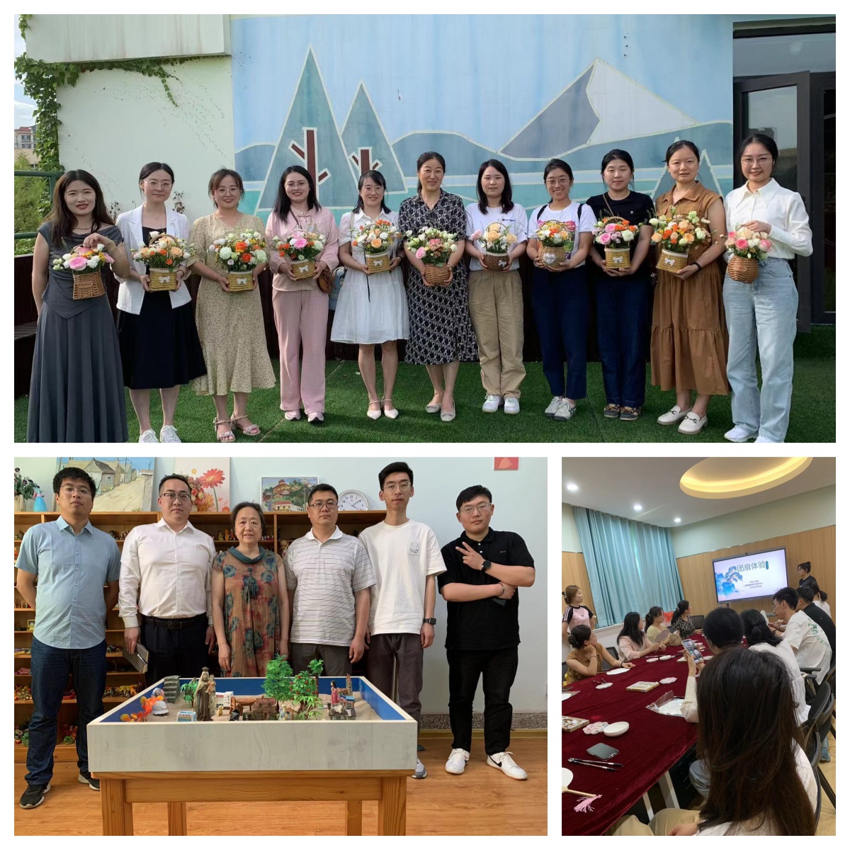 在心理中心老师的指引下,班主任老师们参观了艺术治疗室、心理游戏室、音乐放松室、团体沙盘室等。老师们分组体验了Switch 、沙盘等活动,并在插花和团扇绘制中感受到了艺术和创意的乐趣。