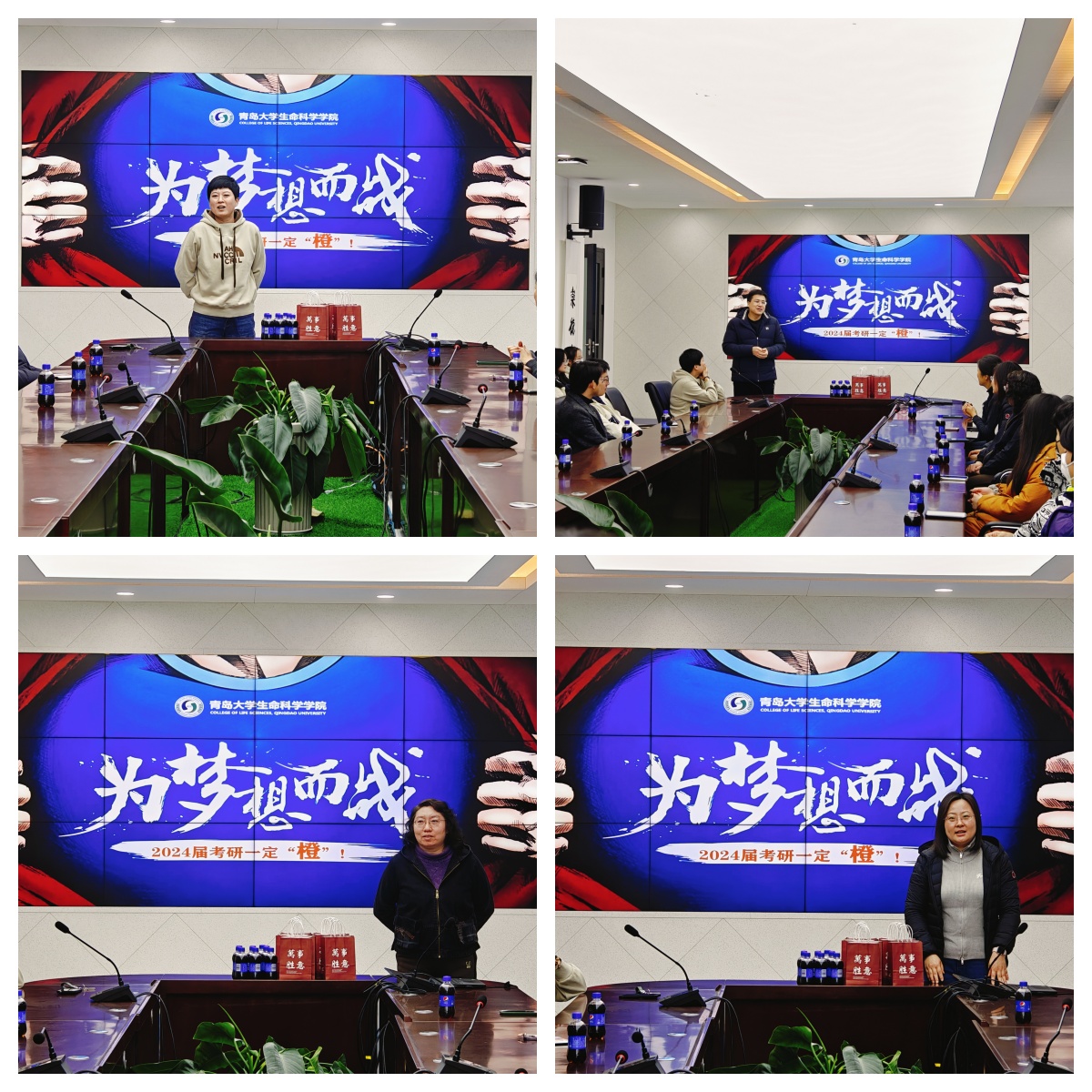 2024年硕士研究生招生考试已进入倒计时,为进一步做好“有温度的教育”,帮助我院2024届考研学子鼓舞考研学子士气,缓解考生复习备考压力,坚定学子上岸决心,增添复习备考动力,12月14日,学院在博雅楼113会议室开展“鱼跃龙门 一战‘橙’硕”考研学子暖心慰问活动。学院党委副书记张雪蕾,生物技术系主任王超,食品科学与工程系主任李子超,教师代表齐宏涛、张亚南亲临现场共同为2024届考研学子送上祝福,活动由毕业班辅导员张海洋主持。